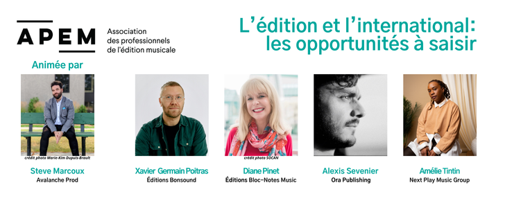 Panélistes: Xavier Germain Poitras (Éditions Bonsound), Diane Pinet (Éditions Bloc-Notes Music), Alexis Sevenier (Ora Publishing) et Amélie Tintin (Next Play Music Group)