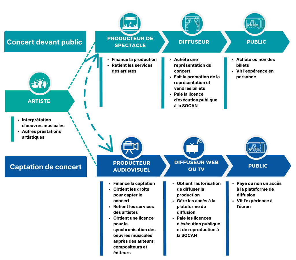 Lorsqu’il y a captation d’un spectacle, la personne qui finance cette captation porte le chapeau de producteur audiovisuel. Le producteur audiovisuel doit obtenir l’autorisation des détenteurs de droits sur l’œuvre musicale et en libérer les droits.