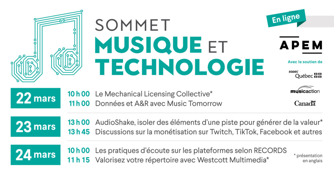 Le Sommet musique et technologie est une série de conférences qui vise à outiller les éditeurs musicaux et les autres professionnels de la musique afin de leur permettre de tirer le meilleur de la technologie. L’événement vise également à informer les participants des principales tendances et développements technologiques affectant la musique.