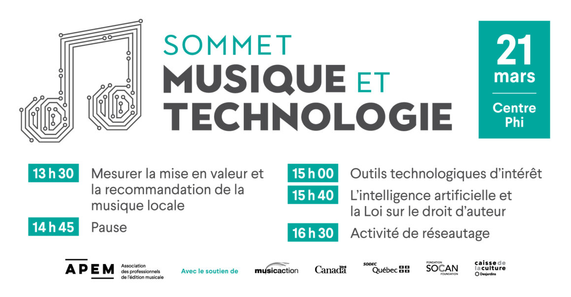 L’Association des professionnels de l’édition musicale (APEM) tiendra la huitième édition du Sommet musique et technologie le 21 mars 2024 au Centre Phi.