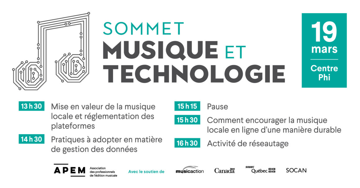 L’Association des professionnels de l’édition musicale (APEM) tiendra la neuvième édition du Sommet musique et technologie le 19 mars 2025 au Centre Phi.