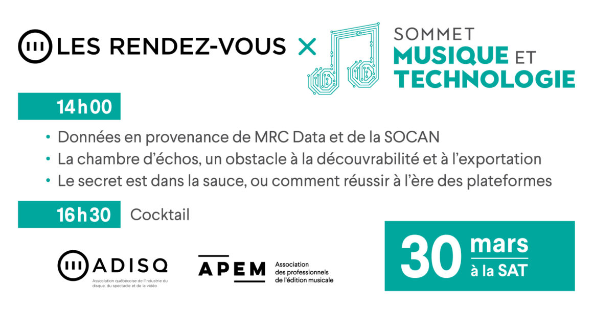 Le 30 mars à 14h00, l’APEM et l’ADISQ ont organisé un événement conjoint à la Société des arts technologiques (SAT) qui a été suivi d’un cocktail. La présentation de l’événement a été possible grâce à la participation financière de la SODEC et de Musicaction, ainsi que la participation annuelle de la Fondation SOCAN.